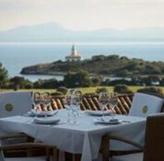 Fra terrassen ser du både banen og Alcudiabukten. Restauranten har meget god mat