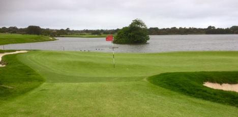 Hull 1 er et krevende par 4 hull under slike forhold med en enorm innsjø dels foran og langs hele venstre side. Hele høyre side består av en waste bunker i en skråning.
