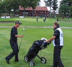 Anders Kristiansen (t.h.) ble beste amatør og beste nordmann sammen med Paul Nilbrink (t.v.) sammen med sin dyktige caddie Arne Sartz-Knudsen som selv er en habil golfspiller her på 3. slaget på dagens siste hull.