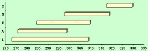 L, A, R, S, X.  Køllene har alle samme lengde og er alle tipkuttet i henhold til leverandørens anvisninger.  Verdiene er tatt fra en meget stor kølledatabase, hvor de fleste stålskaft i markedet er representert.  Tallene er egenfrekvenser.