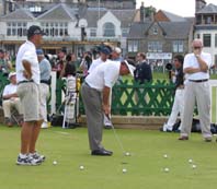 Phil Mickelson sto og trente på denne måten temmelig lenge for å bli vant til underlaget på St. Andrews under The Open samtidig som han finpusset teknikken. Massevis av mengdetrening. Foto: Asbjørn Ramnefjell
