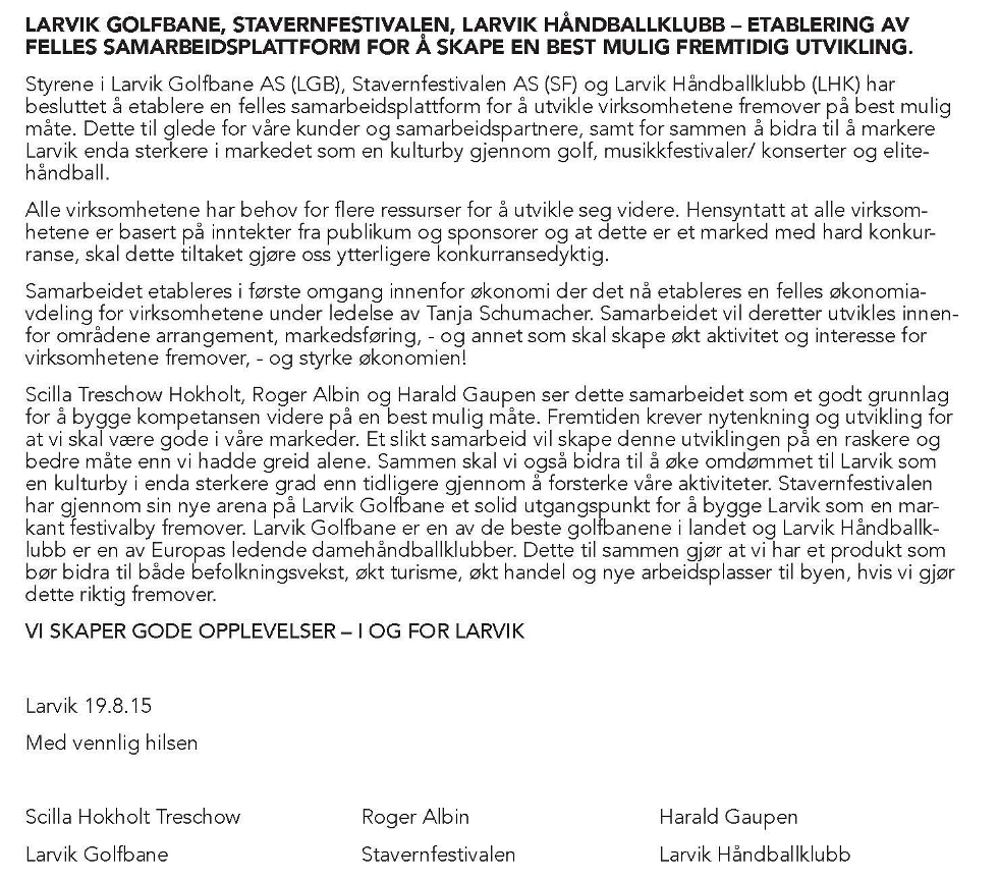 Her er pressemeldingen fra Larvik: