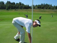 plukke opp ballen fra hull nr 10 etter at han fikk hole ine one i NM på Losby i