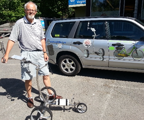 Erik Brynildsen i Chr. Brynildsen & Co i Grini Næringspark importerer Birdie1-trallen til Norge. Her er siste modell foran bilen som bærer reklame for den elektriske sykkelen på døren.